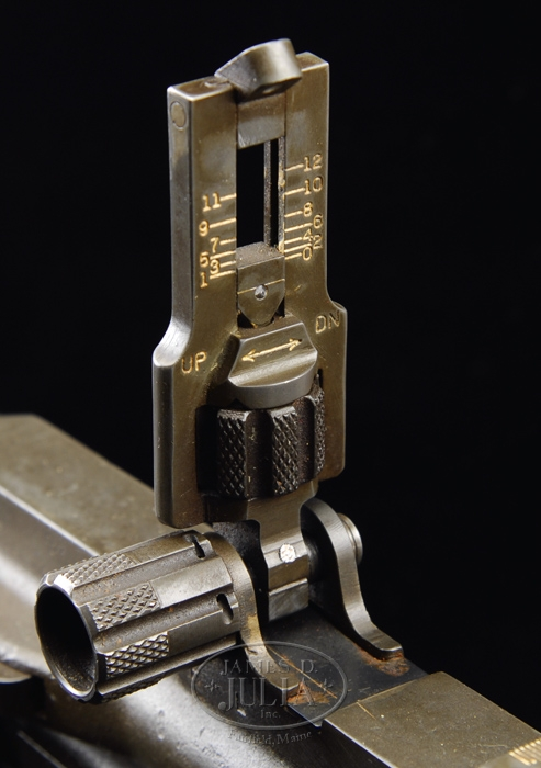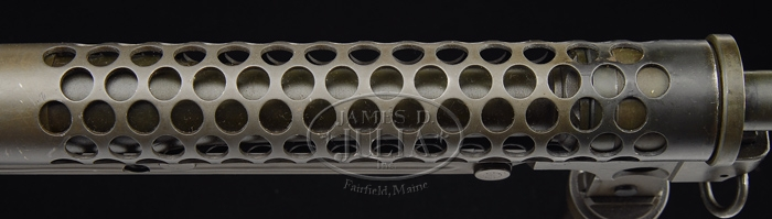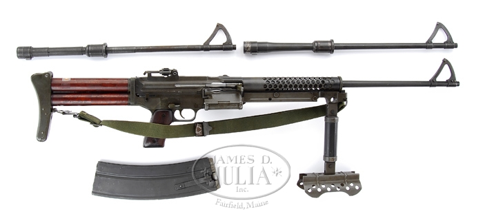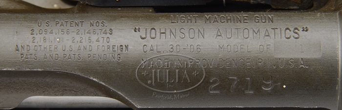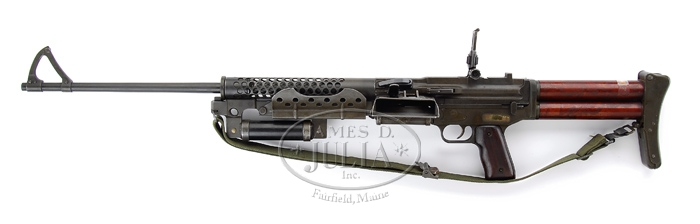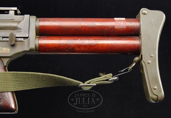 (Additional Information) We are told this is much rarer and more valuable. **JOHNSON MODEL 1944 LIGHT MACHINE GUN. SN 2719. Cal. .30-06. This gun was on display in the Winchester Museum before being purchased by a private collector. 23″ bbl incorporates Johnson’s unique non-adjustable front sight, and perforated bbl shroud. This desirable Johnson machine gun is extremely complete, even including orig. monopod. All metal has a very smooth Parkerized finish. Left side feed horizontal mag well to accept standard 20-rnd magazine. Right side opposite mag well employs spring loaded dust cover exposing a loading gate to charge the magazine with 5-rnd charger clips while still inserted in mag well. The rear sight has intricate micrometer adjustments for both windage and elevation, it also employs a battle sight aperture when simply folded forward. Wooden pistol grip. Butt stock is a unique tubular design with metal butt plate and butt plate folds upward to expose cleaning kit storage area in butt tube. Includes green nylon sling, one mag, and two spare bbls. PROVENANCE: Stern Collection. CONDITION: Very fine. All metal surfaces still retain a fair amount of orig. finish. Very little evidence of use, storage, or handling marks. Unique tubular composite butt stock is fine shape. Wooden pistol grip panels show only minor dings from typical handling and storage. This closed bolt firing mechanism functions well by hand with selector in safe, semi, and full position. Bore is clean with plenty of rifling. 4-34608 JZ15 (10,000-15,000)