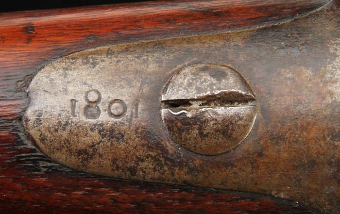 SPRINGFIELD MODEL 1795 FLINTLOCK MUSKET. Cal. 69 NSN. 44-3/4” rnd. bbl. Dated 1801 on buttplate. Lockplate has standard markings. Top of bbl has a “NC” surcharge in addition to the standard “US” and other inspector marks. There is also a “US” script cartouche on left flat of stock. “JC” marked on inside of lockplate but no assembly marks. Orig flintlock. CONDITION: Smooth brown patina on the metal. Stock has been lightly cleaned and shows minor handling marks. Mechanically fine. 4-30813 FS12 (5,000-7,000)