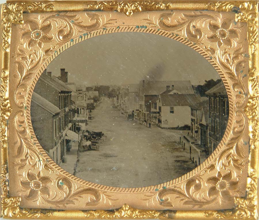 TINTYPE OF TOWN STREET. Probably Waterville, Maine or a surrounding town. Brass frame has oval window which shows a scene looking down a New England dirt street through many buildings. Three carriages with horses are in front of a clothing store. One sign says “Williams House General State Office”. SIZE: 3” x 3-1/4”. Window size is 2” x 2-1/2”. CONDITION: Very good. 9-97932 (200-400)