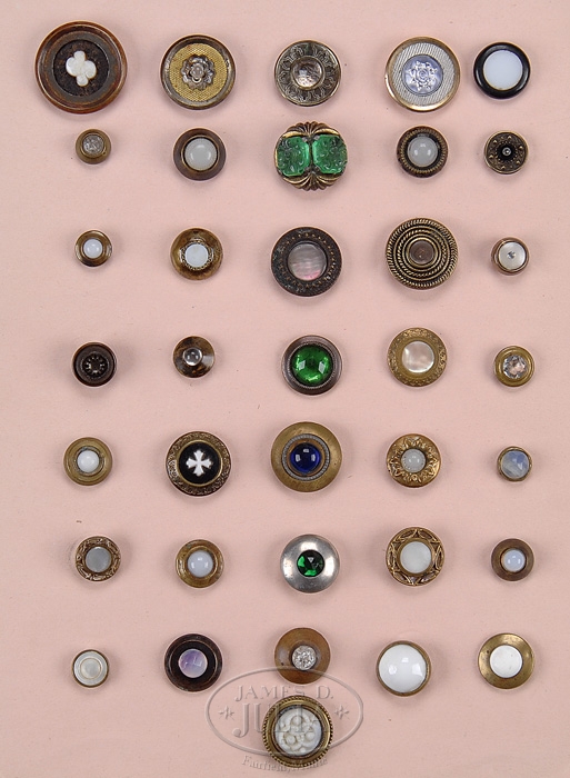APPROXIMATELY 175 CARDS OF METAL BUTTONS. Contained in five boxes. Some with inlays of glass, mother of pearl, enamel, large and small sizes. PROVENANCE: From an advanced central New Hampshire collector’s Estate. CONDITION: Generally very good. 9-93713-9 (500-1,000)