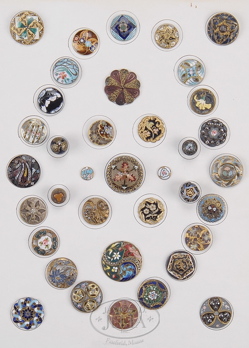 TWENTY-SEVEN DESIRABLE ANTIQUE BUTTON SHOW CARDS. A mixed lot including Seven enamel; Five brass; Four large pictures; One rhinestone; Two glass; One simulated tortoise, One horse; One cloth; One large button; Two mother of pearl; One symbolism and one pewter back pearl trim. PROVENANCE: From an advanced central New Hampshire collector’s Estate. CONDITION: Generally very good. 9-93713-4 (500-1,000)