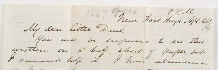 TWO PAGE LETTER TO “MY DEAR LITTLE DURL” SIGNED “BYE BYE, AUTIE”. Near Fort Hayes, April 26, 67, 9 p.m. One sheet, written on both sides. Most of the letter is a chastisement for Libby not writing more often and how he will read himself to sleep. He continues to make an appeal for more letters. 4-30920 (4,000-6,000)