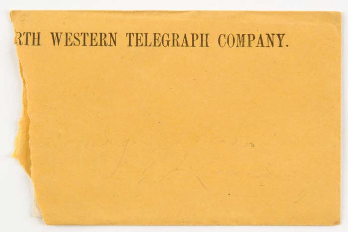 FIVE PAPER ITEMS. Includes 1 & 2) telegram and envelope from O. D. Greene, St. Paul, Minnesota, 1/2/1875, to Cmdy Officer, Ft. A. Lincoln, D.T., referring to the purchase of hay; 3) telegram from J. G. Bennett, Newport A.D. 26 1875 to Geo. A. Custer, Ft. Lincoln, D.T., referring to the value of something undisclosed; 4) telegram from O. D. Greene, A. A. G., St. Paul, Aug 11th 1875, to Cmdy Officer, Ft. Lincoln, D.T., referring to a request for transfer of officers; 5) telegram from Boss (Boston Custer), Bismarck, to General Custer, refers to request of Custer. 4-30904-2 (1,500-2,500)