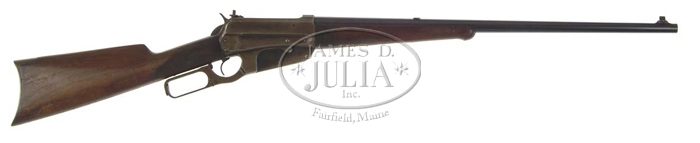 *DELUXE WINCHESTER MODEL 1895 LEVER ACTION RIFLE. Cal. 30-06. SN 417008. Fine deluxe rifle with 24″ tapered rnd bbl, pedestal mounted front sight, slot blank in the rear seat and a correct Lyman Model 21 receiver sight on the left side. Wood is checkered, nicely figured, slab sawed American walnut with black insert “I” style checkered semi-schnable tipped forearm & straight stock with crescent buttplate. CONDITION: Fine plus. Bbl retains about 95% strong bright orig blue with a couple of scratches & spots of light surface rust and light muzzle wear. Receiver retains traces of orig blue in the sheltered areas being mostly a light brown patina. Wood is sound with usual handling & use marks showing heavy wear on the forearm, with the forearm retaining traces of orig finish and the buttstock about 75% orig finish. Mechanics are fine, bright shiny bore. Pierre Renaud Collection 4-55681 JR307 (3,500-5,000)