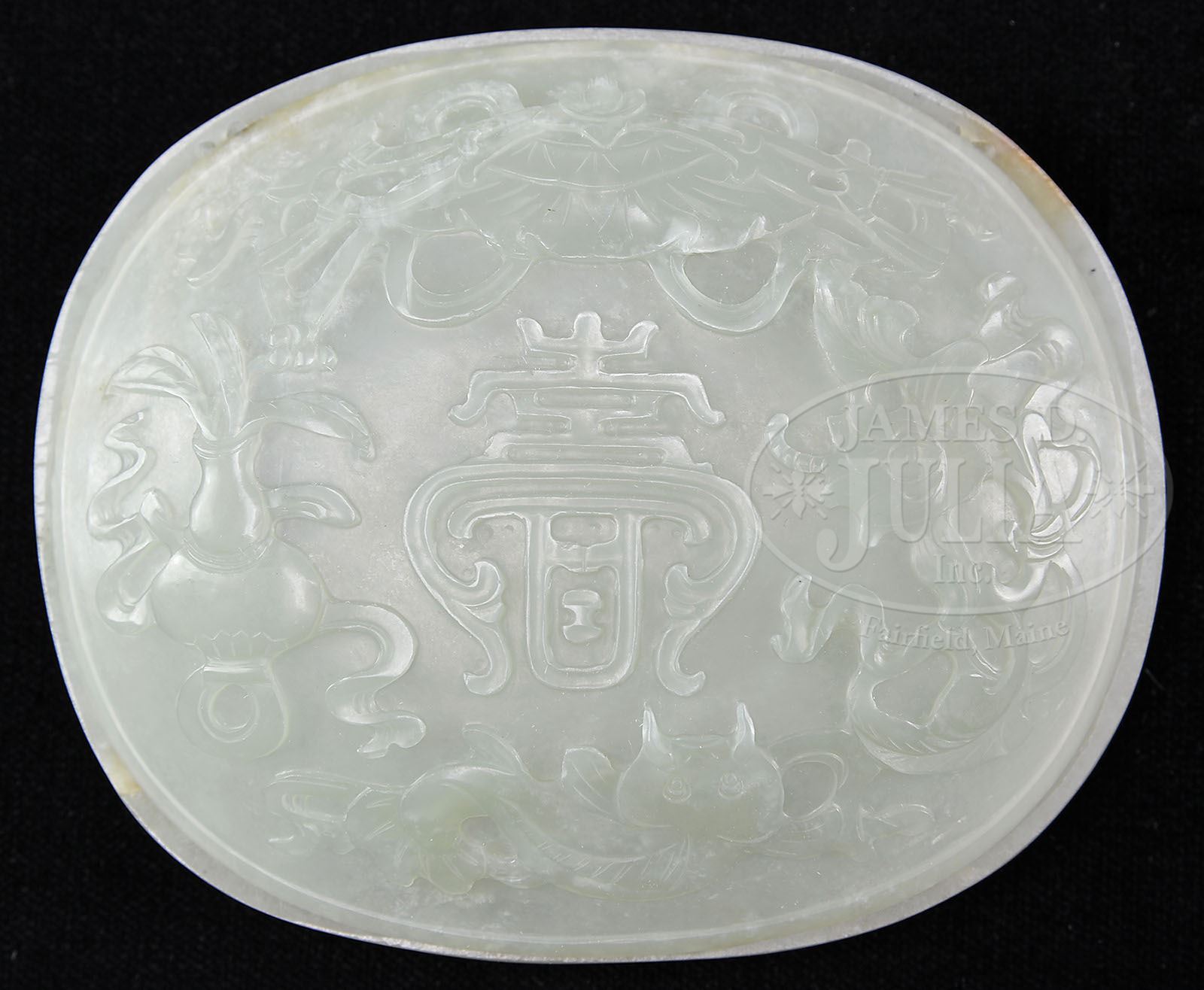 TWO JADE JU-I PLAQUES. 19th century, China. Each of domed oval form, stone of a grey-green color, the surface carved in relief with a central Shou character and with four of the eight precious emblems. SIZE: Approximately 4-1/2″ x 3-3/4″. CONDITION: Normal and expected roughness and abrasions to edges of plaques. Otherwise very good. 7-73595 (400-600)