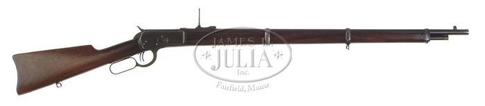 *RARE WINCHESTER MODEL 1892 LEVER ACTION MUSKET. Cal. 25-20. SN 460620. Standard musket in a rare caliber with 30″ rnd bbl, full magazine, modified square base front sight/bayonet lug with modified blade. It has a 900-yard musket rear sight. It is mounted with nicely figured uncheckered American walnut with full-length forearm, three bbl bands & straight stock with carbine/musket buttplate. It is fitted with close couple dbl set triggers. Buttstock & middle band have sling loops. CONDITION: Fine to very fine. Bbl retains 70-75% strong orig blue with some chemical staining around the muzzle and on the magazine tube. On top ofo the bbl, behind the lower band, is a filled non-factory dovetail. Blue around the rear sight is turning plum. Receiver retains about 90% dull orig blue and the lever traces of case color. Hammer retains 85-90% dark case colors. Wood is sound with minor nicks & scratches and a small gouge on the buttstock & retains most of its orig oil finish. Mechanics are crisp, strong bore, dark in the grooves. 4-56464 JR503 (8,000-12,000)