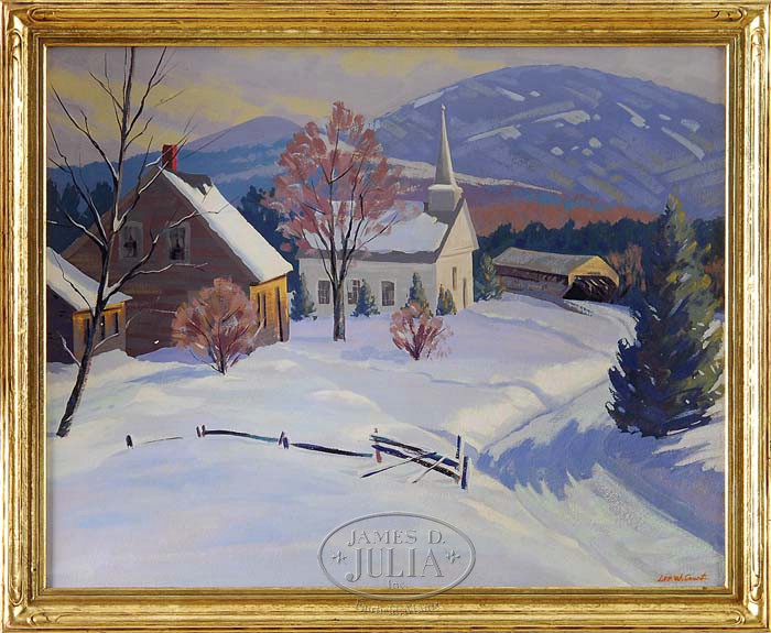 LEE W COURT (American, 1903-1992) WINTER IN NEW ENGLAND. Oil on masonite winter scene shows a snow covered road winding through deep snow to a covered bridge. The road passes a white church and Colonial home. Mountains are in the background. Signed “Lee W Court” lower right. Housed in a gilt period frame. Back marked “#29″. SIZE: 24″ x 30”. CONDITION: Very good. 9-95735 (1,000-2,000)