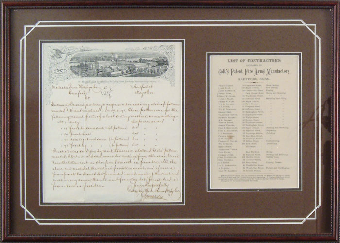 FRAMED COLT MEMORABILIA. The first is a Colt factory letter ordering a large number of castings in1882. The second is a printed list of contractors who were working for Colt in the factory. Included in the list are Cuno Helfricht who was contracting for the engraving and his brother Charles who was doing stocking and browning. Alexander Thuer was listed as “assembling”. James Remington was listed as printing presses and Josiah Howe was listed as reaming. The many other names listed were evidently those in charge of hiring workers for the factory as instructions for applying are at the bottom of the list. This list is interesting as it shows that the work at the factory was done on a contract basis. CONDITION: Fine with slight foxing. 4-60207 FS798 (750-1,750)
