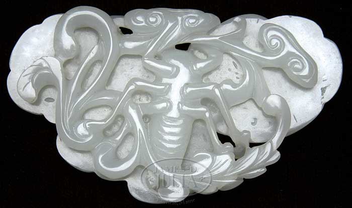 JADE BUTTERFLY PENDANT. 18th century, China, probably Ch’ien Lung period (1735-1796). Carved in form of a butterfly with foliated ling chih scrolling. Stone of an even white color. SIZE: 2″ h x 3-1/2″ w. CONDITION: Very good. 9-25767 (400-600)
