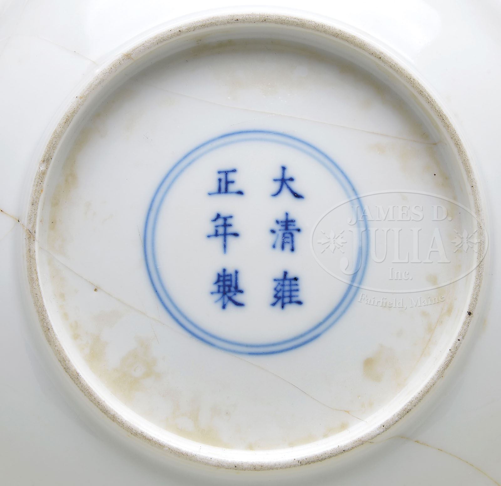 PORCELAIN SAUCER DISH. Yung Ch’eng 6-character mark (1722-1735) and probably of the period, China. Famille Rose decoration of flowers. SIZE: 6-1/4″ dia. CONDITION: Good with some repairs. 9-28738 (400-600)