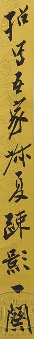 CALLIGRAPHY COUPLET, CHINA, SIGNED “DAQIAN ZHANG YUAN. With two seals, dated the fifth month in bingwu year. SIZE: 66-7/8″ x 10-3/8″. CONDITION: Good. 7-72984 (2,000-3,000)
