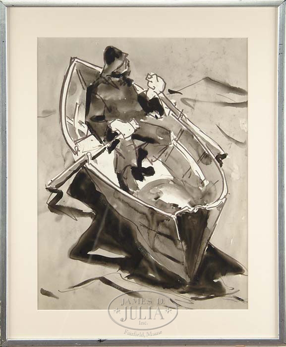 JAMES EDWARD FITZGERALD (American, 1899-1971) “DORYMAN-MONHEGAN”. Watercolor monochromatic scene shows a man rowing in a dory over peaked wave. Attached to back is the original bill of sale from “Edgar F. Hubert” and signed by Edgar and Anne, dated December 3rd, 1975 with title, artist and “This painting was in Mr. Fitzgerald’s studio on Monhegan Island at the time that we took possession under the terms of his will in 1971”. The backboard also has a James Fitzgerald stamp. Housed in a silver frame with white matte. SIGHT SIZE; 25” x 19”. CONDITION: Very good. 9-29939 (4,000-6,000)