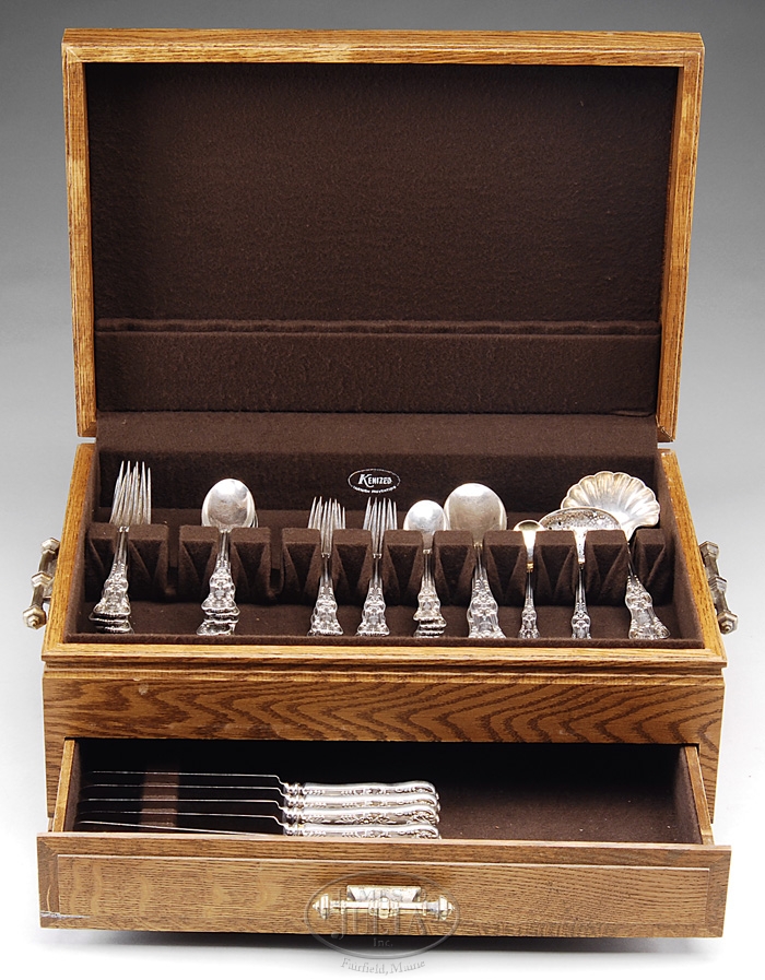 34 PIECES OF TIFFANY STERLING FLATWARE IN THE ENGLISH KING PATTERN. Housed in an oak felt lined modern silver chest. Lot includes six 7-1/2″ forks, six 6-3/4″ forks, three 8-1/2″ spoons, six 7″ spoons, five 5-3/4″ teaspoons, five 9″ knives, one 5-1/2″ reticulated ladle, one 7-1/2″ shell-form ladle and one 4-1/2″ small serving spoon. Triple monogrammed. 60 troy ounces (does not include knives). SIZE: As noted. CONDITION: Shows use with some bending to a few pieces, otherwise very good. 9-96754 (1,500-2,000)