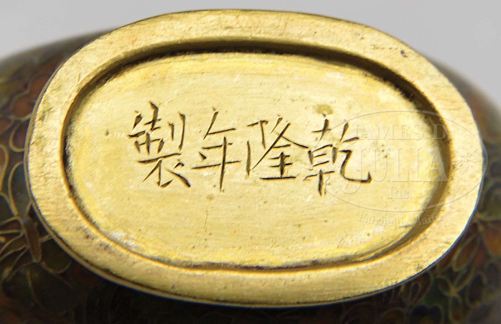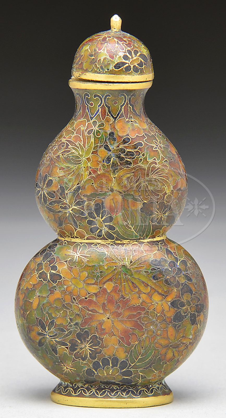 CLOISONNE SNUFF BOTTLE. Ca 1900, China. Flattened double gourd form with Mille Fleurs decoration. Four character Ch’ien Lung mark on the base. SIZE: 3″ h. CONDITION: Very good. 7-73620 (200-300)