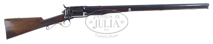 COLT MODEL 1855 REVOLVING SHOTGUN. Cal. 10 gage. SN 1000. 30” part oct bbl. Standard markings on top of the frame. Markings on the left side were mostly removed during an old and possibly factory reblue. CONDITION: Retains 98% of the reblue finish. Wood is fine with some original finish and some loss to the refinish towards the buttplate. Gun is clean, sharp and mechanically perfect. 4-57180 (2,500-3,500)