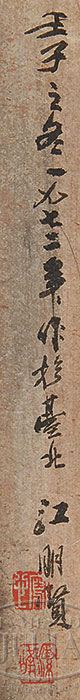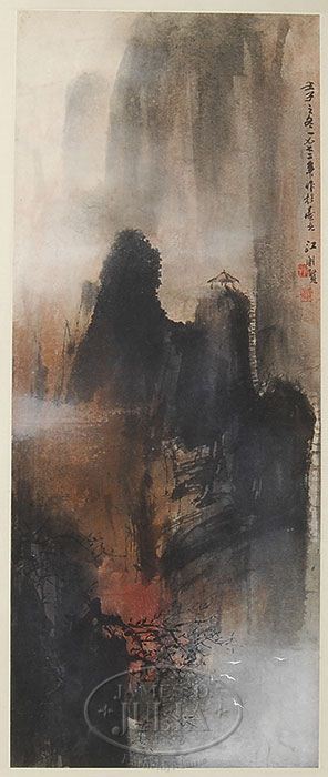 MODERN PAINTING, JIANG MINGXIAN (B. TAIWAN, 1942). Ink and color on paper, depicting a pavilion on top of mountains in the dawn. Signed, dated winter in renzi year (1972), SIZE: Image: 34-3/4″ x 14″; Overall 45″ x 19-3/4″. CONDITION: Good. 7-73164 (2,000-3,000)