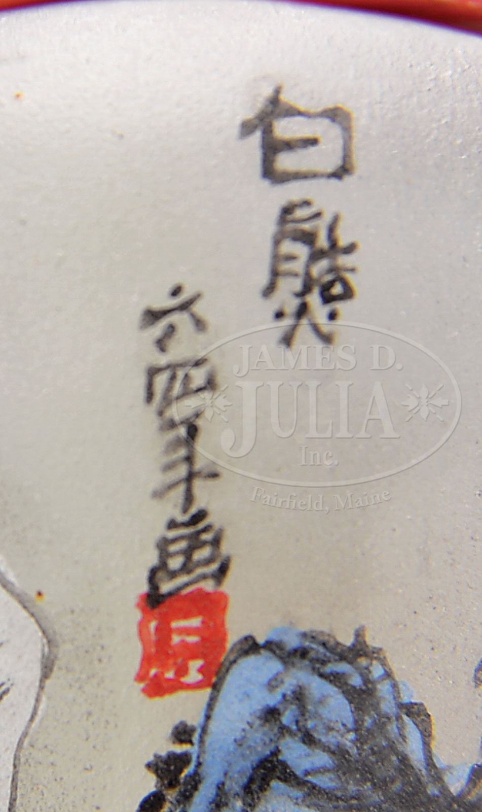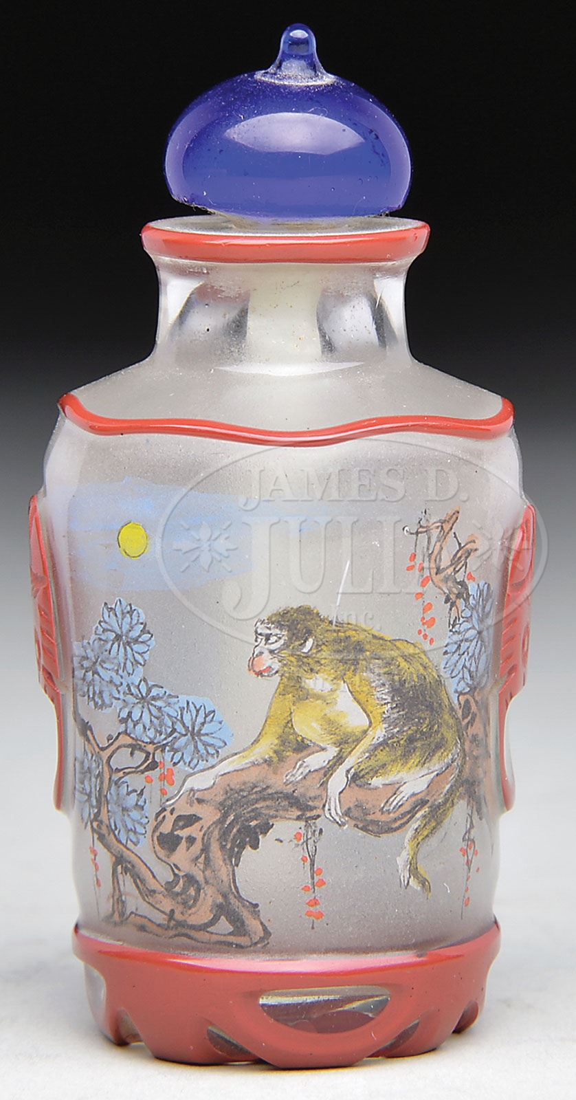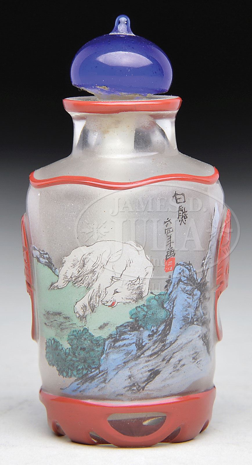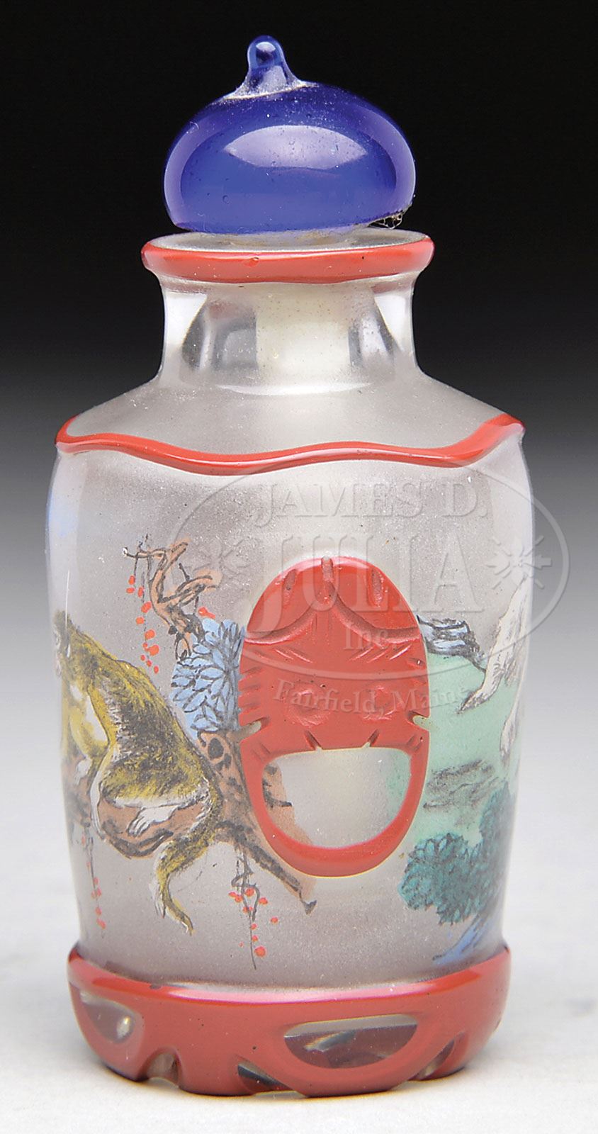 Please Note: Date should read “Late 19th/early 20th century”. SNUFF BOTTLE. Late 19th/early 20th century, China. Brick red overlay cut through to clear. Interior painted with decoration of wolf and monkey. With faux lion mask jump rings. Signed above shoulder of wolf. SIZE: 2-1/2″ h. CONDITION: Very good. 9-29447 (400-600)