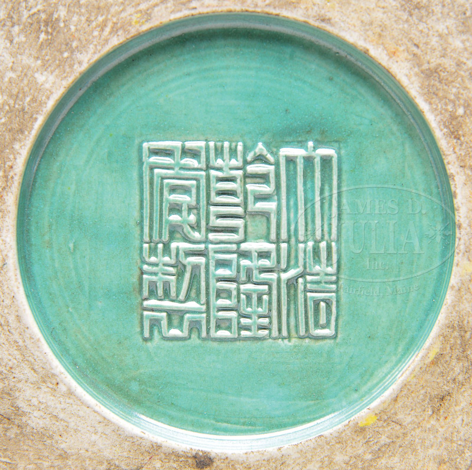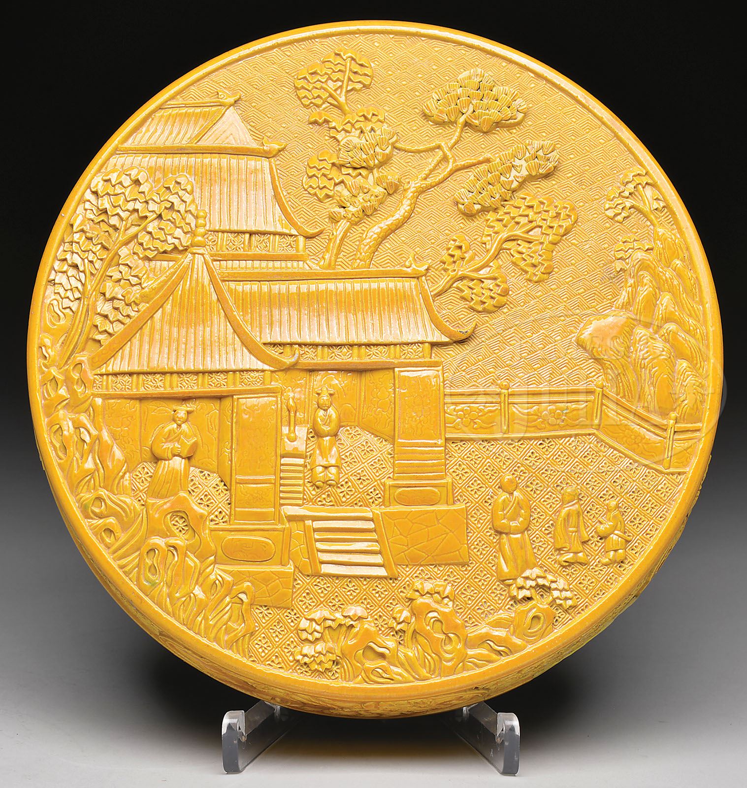 PORCELAIN BOX. 20th century, China. Molded decoration of figures in a palace with reserves of landscapes and various diaperwork patterns. Mustard yellow glaze with a turquoise interior. Ch’ien Lung mark on the base. SIZE: 11-1/2″ dia. CONDITION: Area of repair to inside of lid. Minor glaze flakes. Otherwise good. 9-90000 (3,000-4,000)
