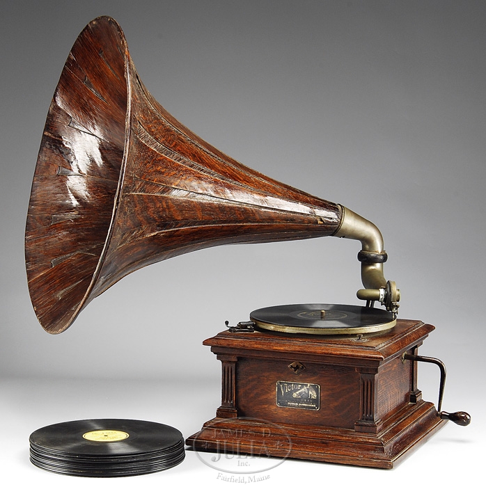 VICTOR TALKING MACHINE, STYLE: VIC III WITH OAK HORN. First quarter 20th century. This oak tabletop model with original exterior oak horn retains the original label with model number 16655A designating a year of manufacture probably 1917-18 and is being sold with a small collection of 78rpm records. SIZE: Case: 8″ h overall x 14″ x 14″. Horn: 25-1/2″ h overall x 22″ d. CONDITION: Horn and player retain original finish, labels intact and legible, arm and reproducer also present. The laminated horn dry with some sections loose. Overall condition fair to good. 9-96485 (800-1,200)
