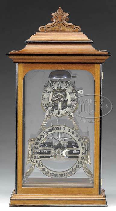 ITHACA BOX “SKELETON” SHELF CLOCK. Last quarter of the 19th Century. The walnut ebonzied case framing a skeletonized movement. the double dial perpetual calendar clock with an eight-day spring movement with strike on bell. SIZE: 22″ h x 11″ w x 7-1/4″ d overall. PROVENANCE: Ex-Alfred Scott Collection, 1970; Ex-Maynard Bell Collection, 1975; Ex-George Snow Collection; Ex Jowell Bernick Collection to current owner. Dr. Charles Bradley, Lubbock, TX. CONDITION: This example with professional restoration. 9-21094 (8,000-10,000)