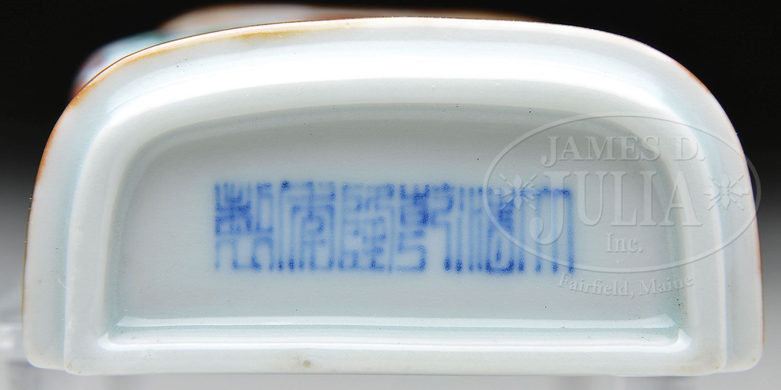 PORCELAIN WALL POCKET VASE. 20th century, China. Flattened Tsun form Tou Tsai decoration of stylized floral scrolling with acanthus borders. 6-character underglaze blue Ch’ien Lung mark on base. SIZE: 7-1/8″ h. CONDITION: Very good. 9-29936 (700-900)