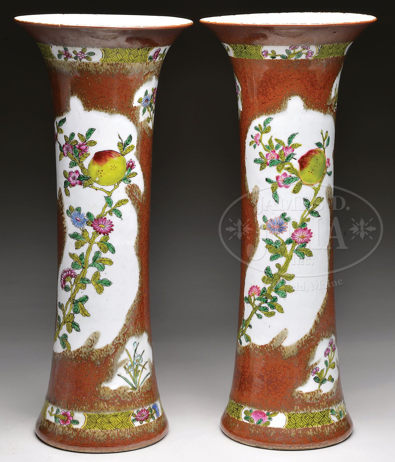 PAIR OF PORCELAIN BEAKER VASES. 19th century, China. Peach bloom ground with leaf shaped Famille Rose reserves of flowering peaches. SIZE: 18-1/2″ h. CONDITION: Very good. 7-74108 (800-1,200)