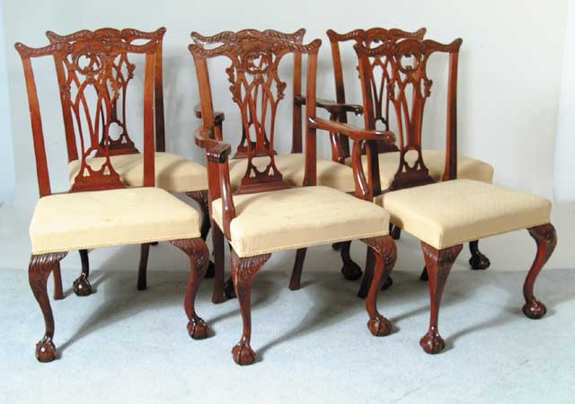 FINE SET OF SIX CENTENNIAL MAHOGANY CHIPPENDALE STYLE DINING CHAIRS. Set consists of four side and two arm chairs. Good pierced splat with carved crest, carved ball and claw foot, legs with leaf carving. Gold over upholstered seats. SIZE: 38” h x 18” seat height. CONDITION: Refinished. Very good, some stains to upholstery. 9-92782 (2,000-3,000)
