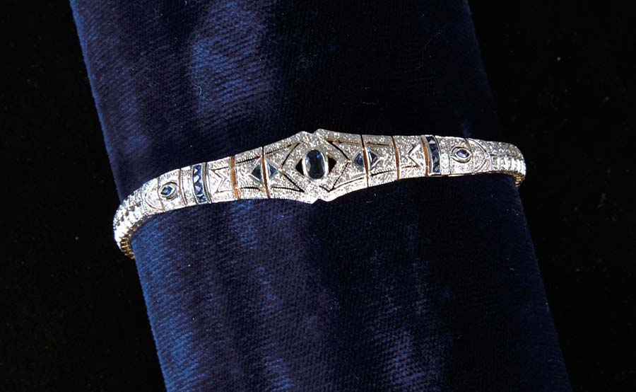 DIAMOND & SAPPHIRE BRACELET. Very beautiful bracelet is 14k yellow gold topped with 14k white gold. The bracelet is completely encrusted in single cut diamonds, total diamond weight is approx. .84ct and highlighted with beautiful blue sapphires, total weight approx. 1ct in oval cut, trilliant cut and square cut. Bracelet is finished with a hidden safety clasp and is marked “14k”. SIZE: 7” l. CONDITION: Very good to excellent. 5-71374 (1,300-1,700)