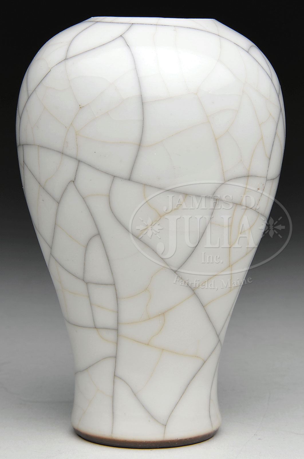 PORCELAIN VASE. 19th century, China. Kuan Yao style with a crab-claw crackle on an ivory ground. SIZE: 5-3/4″ h. CONDITION: Shallow chip to interior of base rim. Otherwise good. 7-74056 (200-300)