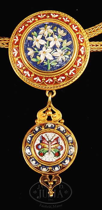 EGYPTIAN MICRO MOSAIC AND GOLD PARURE. Second half 19th century. Presented in its original leather case, the three piece parure consisting of a necklace with woven rope gold chain joined by a floral micro mosaic domed clasp continuing to three micro mosaic pendants, the centermost with a cherub on a white ground above a lesser scrolled pendant Orthodox cross, flanked by rosettes of micro mosaic floral sprays, each with a drop pendant decorated with a micro mosaic butterfly. The bracelet with a pair of rosettes, each with a polychrome jeweled sacred scarab. The circular brooch similarly decorated with a micro mosaic jeweled sacred scarab. SIZE: 15-1/2″ l of necklace. PROVENANCE: From a prominent Southern Connecticut family. CONDITION: Very fine old original condition. Clasps and fasteners intact. Some minor losses to micro mosaic work in clasp of necklace together with other minor individual losses. Gold metalwork is unmarked and untested. 9-96532 (10,000-20,000)