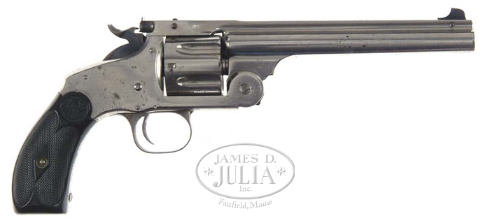 SMITH & WESSON NEW MODEL #3 TARGET REVOLVER. Cal. 44 Russian. SN 22477. Nickel finish, 6-1/2″ keyhole bbl, and Smith & Wesson target sights with Smith & Wesson embossed hard rubber grips. Accompanied by a Smith & Wesson factory letter identifying this revolver as having been shipped December 10, 1887 to Mr. A.C. Gould, Boston, Mass. Letter further states “Mr. Gould was a target shooter and one of the founders of the modern pistol course of fire”. CONDITION: Fine plus. All matching including the grips. Overall retains about 90% orig nickel with fine pimpling on the bbl and frame. Back strap has flaked spots with a dark patina showing through. Center sideplate screw appears to have been cleaned and other screws slightly battered. Grips show moderate wear. Mechanics are fine, very bright shiny bore. 4-57039 JR387 (2,750-3,750)