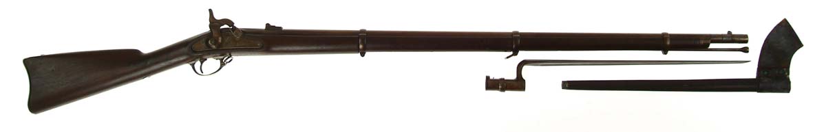 SPRINGFIELD MODEL 1863 RIFLED MUSKET W/BAYONET & SCABBARD. NSN. Cal. .58. 40” part oct bbl. Dated 1864 on the tail of the lockplate. The cartouches are faintly visible but no readable. CONDITION: All surfaces are covered with dried oil & dirt, so it is difficult to tell, but there appears to be much case hardening on the lockplate and hammer. Wood has been lightly sanded, rounding the edges. Bayonet is good. Scabbard is a reproduction. Mechanically fine. 4-54450 FS50 (1,000-1,500)