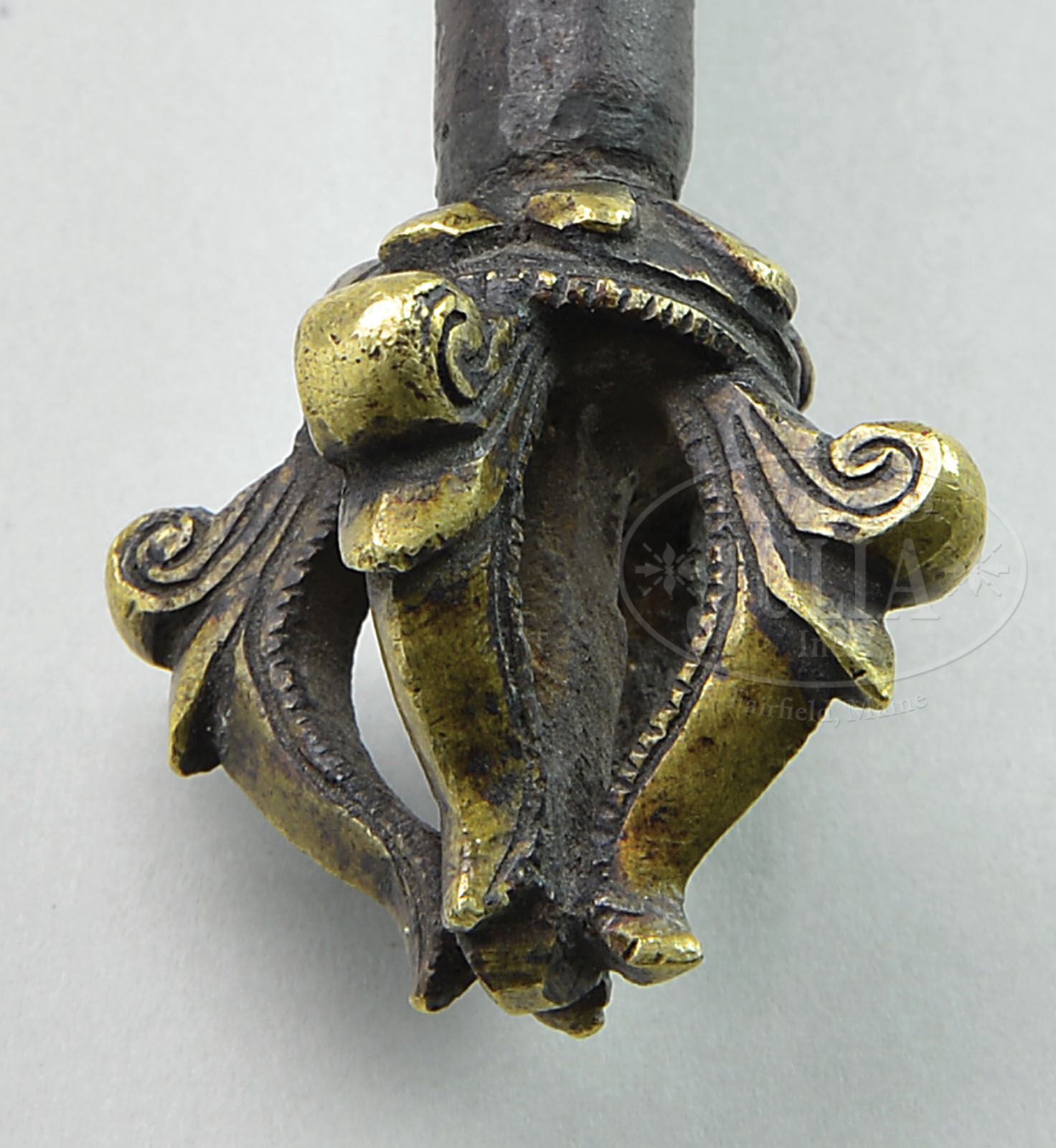 TANTRIC RITUAL AXE. 19th century, Tibet. Bronze axe blade with an iron shaft ending in a bronze vajra. SIZE: 21″ l. PROVENANCE: From the private collection of the late Professor Theodor Lugs by descent through the family to his daughter. CONDITION: Very good with undisturbed color and patina. 9-29953 (300-500)