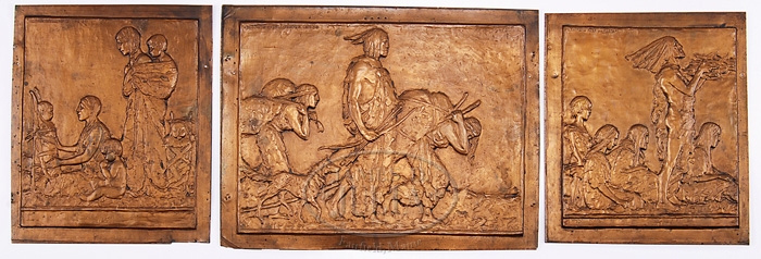 RAYMOND AVERILL PORTER (American, 1883-1949) 3 MOLDED COPPER PLAQUES. This fine set of three pressed or molded copper plaques depicting scenes of Native Americans in everyday life. Two impressed in upper left corner “RAYMOND AVERILL PORTER 1913 SC”. One impressed “RAYMOND AVERILL PORTER 1912 SC”. Each with a flattened edge as if for framing, each with small holes drilled for affixing to a backing. SIZE: Largest 13-1/4″ h x 17-1/3″ w. Two are 13″ h x 11″ w. CONDITION: Overall very good, retaining original surfaces. 9-96617 (1,000-1,500)