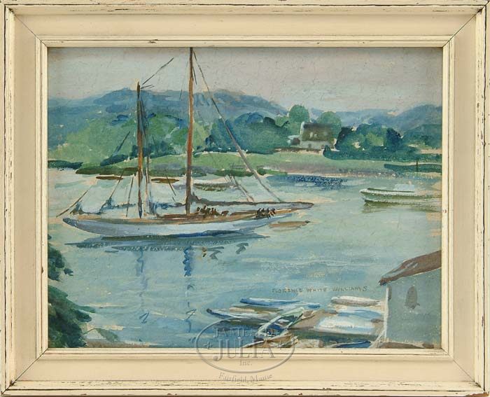 FLORENCE WHITE WILLIAMS (American, 1900-1953) SCHOONER. Oil and watercolor scene shows a two-mast schooner with sails down moored in a tranquil harbor with house, trees and hills beyond. Probably a Maine coastal scene. Housed in its original white painted molded wood frame have a “J. H. Miller Co. Springfield, Mass” label to reverse. SIGHT SIZE: 9-1/2” x 12-1/2”. CONDITION: Very good. 9-70029 (800-1,200)