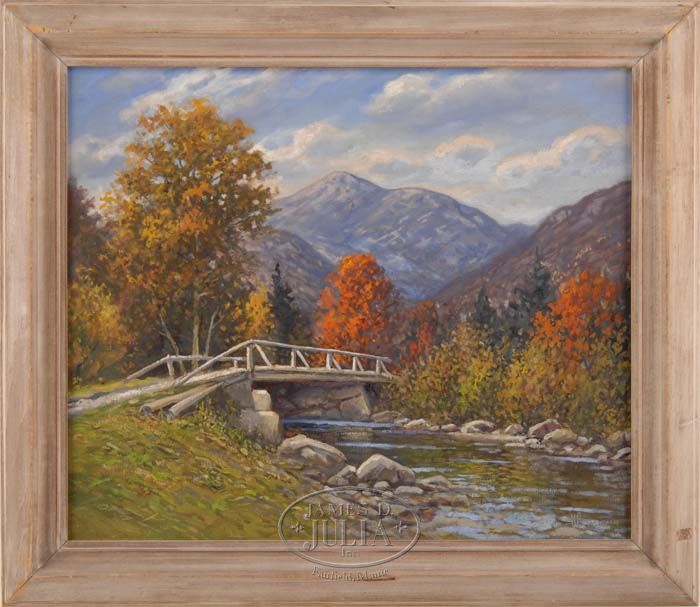 HENRY HARLOW HOWE (Wm. F. Paskell) (American, 1866-1951) BRIDGE AT WONALANCET RIVER (Tamworth, NH Mt. Paugus). Oil on canvas fall scene shows a wooden bridge over a small river lined with rocks and colorful trees. In the background is a large mountain under blue and white clouds. Signed lower right “H.H Howe” which is understood as a psuedomym of William. F. Paskell. Housed in a white washed molded wood frame which appears to be original. SIZE: 22” x 26”. CONDITION: Very good. 9-74758 SM (700-900)