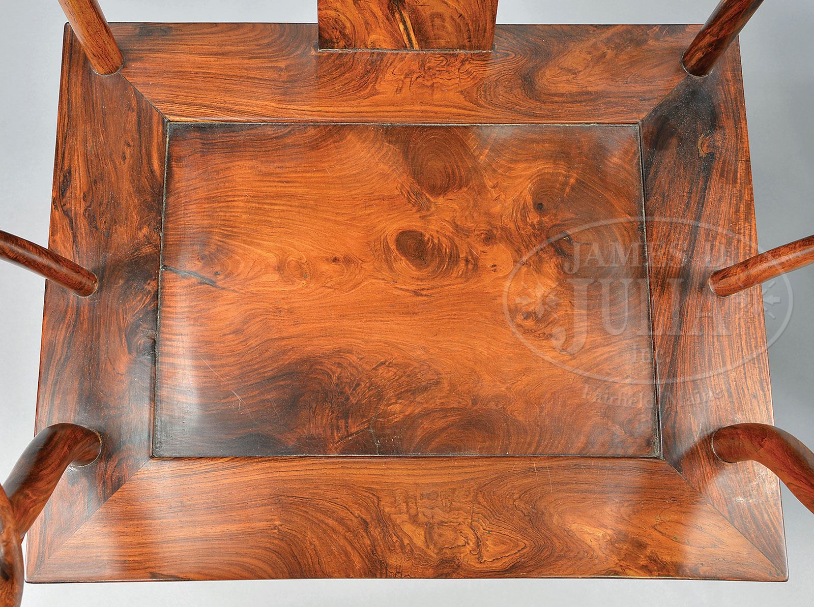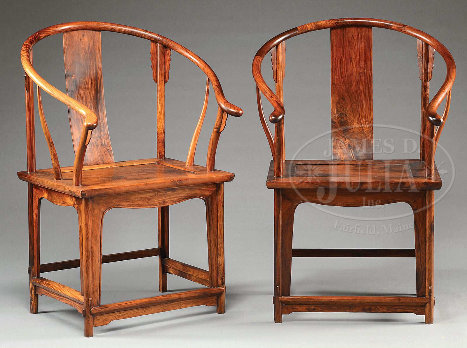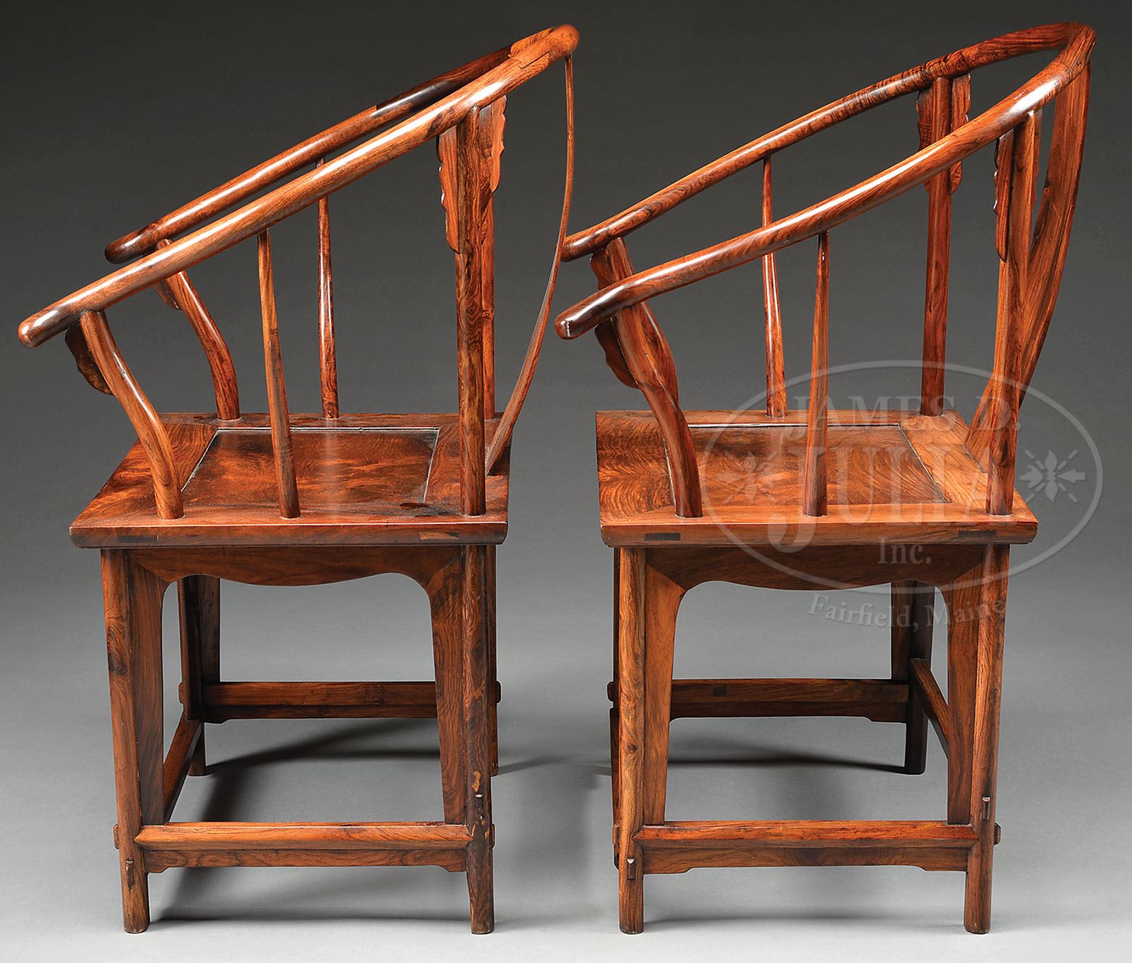 FINE PAIR OF ANTIQUE CHINESE HUANGHUALI HORSESHOE BACK ARMCHAIRS. Each curved back with dowswept arms and outswept hand grips centering a shaped splat flanked by cylindrical stiles continuing to undulating arm supports. Rectangular seat with inset panel, raised on cylindrical legs joined by a flattened box stretcher. The legs with undulating picture frame moldings. SIZE: 41-1/4″ h and 39-3/4″ h. Seat: 20″ h. PROVENANCE: From a private collection, Great Britain. CONDITION: The well figured chairs professionally restored and repolished, the rectangular seat panels possibly later additions. Good professional restoration to old split at center of crestrail on one chair (see photo), otherwise very good. 9-29589 (100,000-125,000)