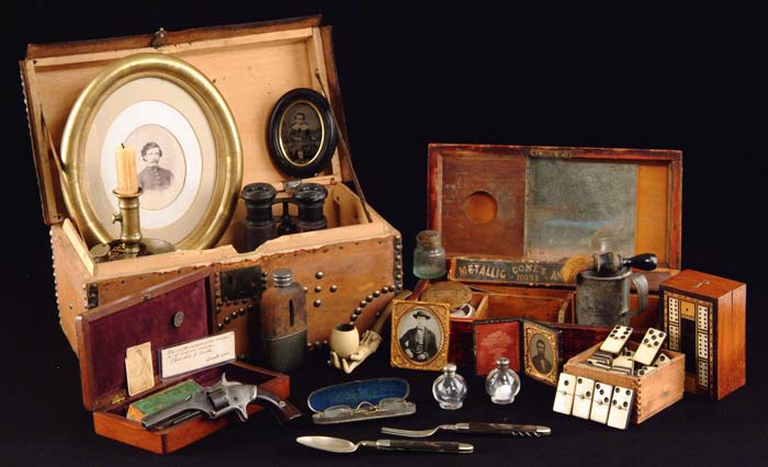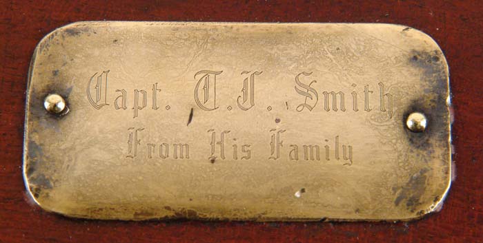 SMITH & WESSON FIRST MODEL SECOND ISSUE REVOLVER AND LARGE LOT OF CIVIL WAR ITEMS IDENTIFIED TO CAP’T T. J. SMITH. Cal. 22 Short. SN 30092. 3-3/16” oct bbl with rib. Standard 1-line marking on top of bbl with line of patents around center of cyl. CONDITION: Very good to fine with 95% tarnished silver on frame, 40% blue on bbl and cyl mixed with light surface rust and pitting. Grips show wear at high points but retain 80% varnish. Period mahogany case has a silver-plated brass plate on top engraved in Old English “CAPT. T.J. Smith / From His Family”. Case is lined with purple velvet and contains a UMC green label cartridge box containing 49 Winchester cartridges, a sepia tone image of a young woman, a GAR silver stick pin, a key that works the lock and a hand written tag stating that “This Smith & Wesson pistol belonged to my Civil War ancestor, Thorndike J. Smith.” CONDITION: Box is fine. Interior is stained with some damage to the bottom. Partition around cartridge box is missing. There is also a framed, oval, sepia tone picture of Captain Smith, slightly faded with repairs to the frame and an image in a daguerreotype frame purporting to be Smith at an older age, also a wood framed daguerreotype of a young person. Part of the image has adhered to the glass. Also included is an 1835 King James Bible with Smith’s initials in ink on the frontispiece; an 1864 Book of Psalms with gold edged pages; a brass candle stand with candle; an empty Civil War era leather wallet; a folding fork, spoon and corkscrew set in a leather case, German silver with horn scales; a tiny teacup with no markings; a pewter topped drinking flask with leather cover on top missing the cup, leather scuffed; a 4-1/2” diameter hand mirror with painted black wood frame with minor chipping to the paint; an unidentified daguerreotype of a bearded gentleman in a fabric covered case; 2-3/4” diameter 2-pc wood box with badly chipped rim; a Civil War period sewing kit containing needles, strips of cloth, a thimble, spare buttons and an unopened package of 20 needles with several pins stuck in the pincushions on the ends; a small pair of glass salt and pepper shakers; a Barnard 1864 patent candlesnuffer; a pair of Vendome Civil War period binoculars with one of the leather covers loose but complete and optically good; a celluloid pipe with a hand holding the bowl in very good condition; a partial set of dominoes with only the blank and one complete and very few of the high denominations present, totaling 22 tiles with 4 duplicates; a folding box with marquetry cribbage set; a small spirit light marked “4-3/4”, badly corroded; portable pewter cup in jappanned tin box; a pair of spectacles in tin box; a tiny spoon with unidentified hallmarks; GAR ribbon holder in poor condition; a gold filled and hair watch chain; a tin box containing glass bottle containing white pellets, 2 sticks of wood matches and an empty tin for Payson’s indelible ink with about half of the red paint remains outside; a wooden pestle; a pair of captain’s epaulets in orig black metal box with gold trim on the 9-3/8” by 6-3/8” box; a cloth sugar bag; a pen and nib; a tartan shawl with handwritten label “Great-grandfather’s Civil War shawl”; a large striped wool coverlet in fine condition; a leather covered wooden box 15-3/4” by 8-5/8” by 7-3/4”,. decorated with tacks and with key missing with some damage around the lock from prying; a 12-5/8” x 6-1/4” x 3-5/8” wood shaving kit containing one Boker straight razor, sharp, one Rome straight razor, dull, a cone square razor strop with orig slip cover, a tin cup, a container of Bazin shaving soap, an empty glass bottle, a wooden box containing an Oriental seal ring, a celluloid manicure set, a brass folding comb and a mirror, with most of the black finish missing from the box, but with the red primer almost intact; and a 20” x 16” x 20” domed metal bound wood trunk with paper lining, with a little bit of mildew and solid, good exterior but deteriorating interior. 4-31027 (5,000-7,000)
