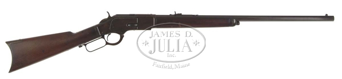 SPECIAL ORDER WINCHESTER MODEL 1873 LEVER ACTION RIFLE. Cal. 32 WCF (32-20). SN 126592. Standard grade rifle with 24-1/4″ oct bbl, button magazine, half nickel front sight & semi-buckhorn rear sight. Rear seat in the bbl has possibly been altered, as there is a shim around the sight dovetail. Wood is nicely figured American walnut, uncheckered, with straight stock & crescent buttplate without trap. CONDITION: Very good plus. Bbl retains 75-80% orig blue turning plum and the receiver appears to be mostly a plum brown patina. Lever & hammer retain 60-70% faded case colors. Entire rifle has a heavy coating of old dried oil or wax. Wood is sound with light nicks & dings and an area of paint speckles on the toe and retains an even hand rubbed patina. Right side of the receiver, behind the sideplate, has a series of small dings. Mechanics are fine, bright shiny bore. Pierre Renaud Collection 4-55645 JR245 (1,250-1,750)