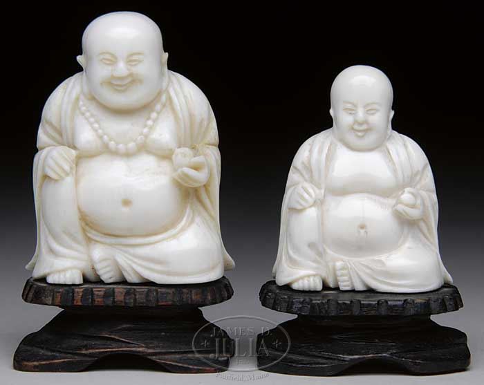 TWO CARVED IVORY BUDDHAS. 19th, early 20th century, China. Each Mi Lo Fu figure seated on a lotus throne. SIZE: Overall: 3-1/4″ h and 2-3/4” h. CONDITION: Very good. 9-26667 (400-600)