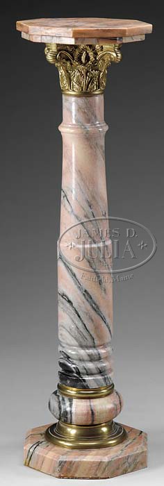 NEOCLASSICAL ROSE MARBLE PEDESTAL. 20th century. The octagonal top joined to a Corinthian column base. The capital and base cast metal mounted. The rose marble with gray graining. SIZE: 47″ h x 13″ w. CONDITION: Very good. 9-21188 (400-600)