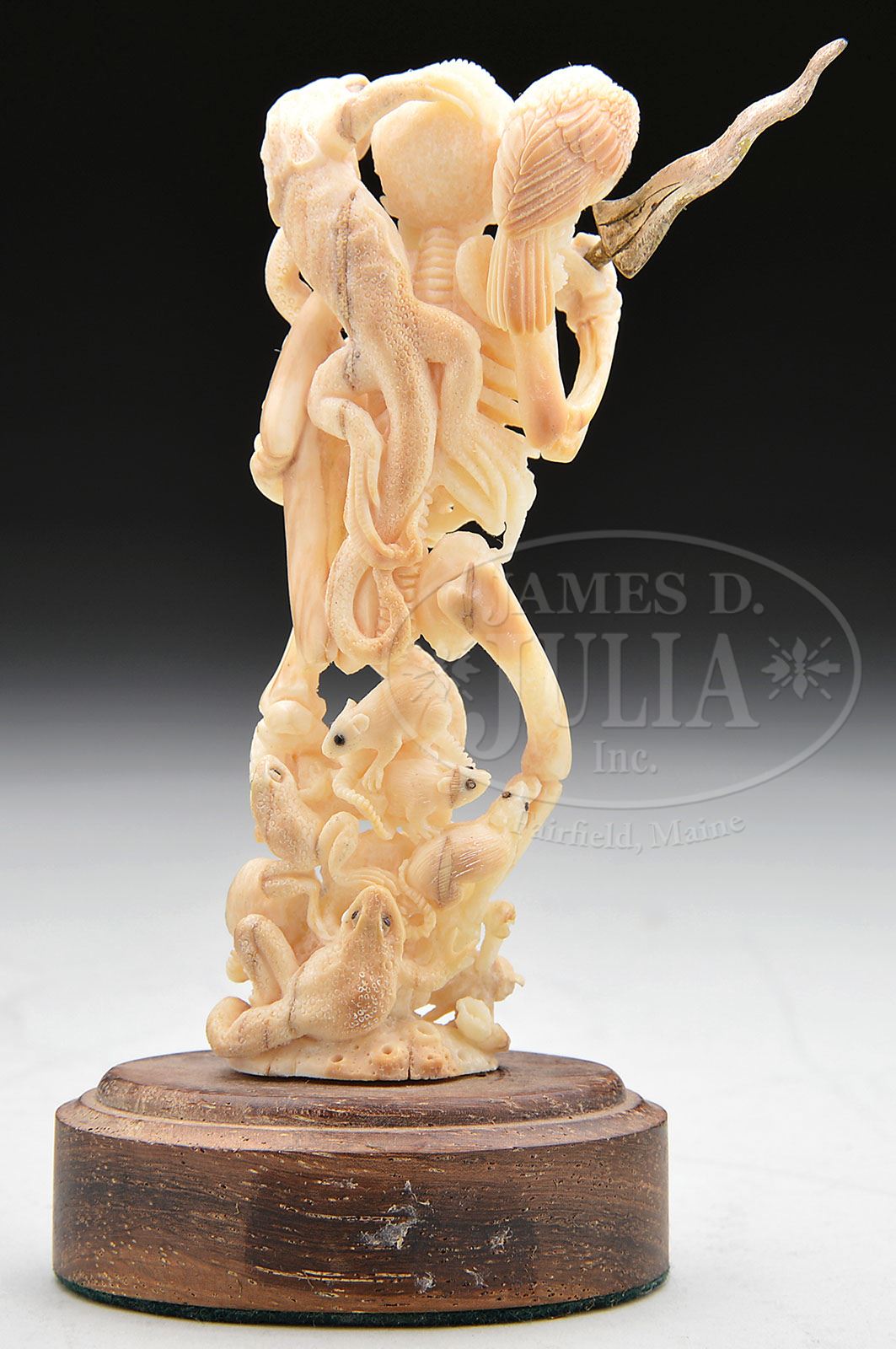 FINE CARVED IVORY FIGURAL GROUP. 19th century, possibly Japan. Depicting a skeleton wielding a metal flame bladed sword with lizard, vulture and serpent on his body standing amidst a cluster of animals including rats, frogs, lizards and scorpion. All mounted on an oval hard wood stand. SIZE: 6″ h. CONDITION: With natural fissures and vertical hairline shrinkage cracks. Mellow patina. Very good overall. 9-29808 (800-1,200)