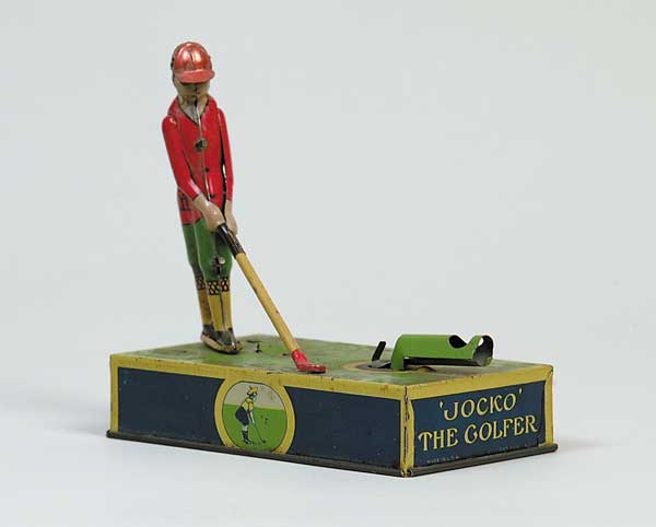 TIN “JOCKO” WINDUP GOLFER TOY Great lithographed golf related toy with pullstring. Features Jocko in red, green and yellow outfit atop lithographed base. Toy has cylindrical chute, which would place a series of balls (not included) on the tee while Jocko swings. SIZE: 6-1/2″ l x 6-1/2″ h x 4″ d. CONDITION: Generally good with mild pitting on surface. 1-647 (400-600) Auction: Advertising, Toy & Doll - Spring 2003 Please Note: All prices include the hammer price plus the buyer’s premium, which is paid by the buyer as part of the purchase price. The prices noted here after the auction are considered unofficial and do not become official until after the 46th day. |