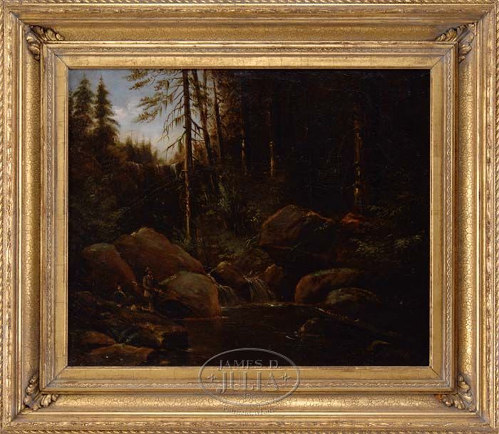 UNSIGNED (19th Century) “RELIABLE FISHING QUARTERS”. Oil on canvas painting copied from Mr. J. B. Wandesforde’s (Juan Buckingham Wandesforde American, 1817-1902) painting of Reliable Fishing Quarters. This inscription is found on the back of the canvas. Scene shows two gentleman fishing in stream pool with cascading water over rocks and waterfall behind. Scene is flanked by tall trees with an area of blue sky with white clouds. Housed in a period gesso decorated gilt frame. SIZE: 20” x 24”. CONDITION: Very good with some inpainting having several canvas patched to reverse. 9-74535 SM (1,000-1,500)