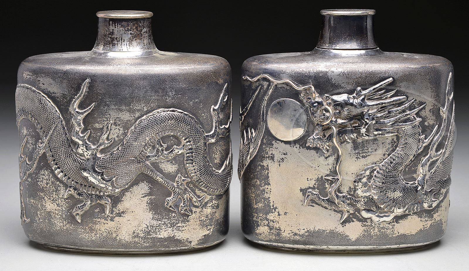 PAIR OF SPELTER FLASKS. Circa 1900, Japan. Cast decoration of dragons and pearls on a silver surface. Oval shaped. Hallmark on base “ZEE SUNG”. SIZE: 7-1/2″ h. PROVENANCE: From a private U.S. collection. CONDITION: With wear to silvered surfaces. Structurally good. 9-28809 (400-500)