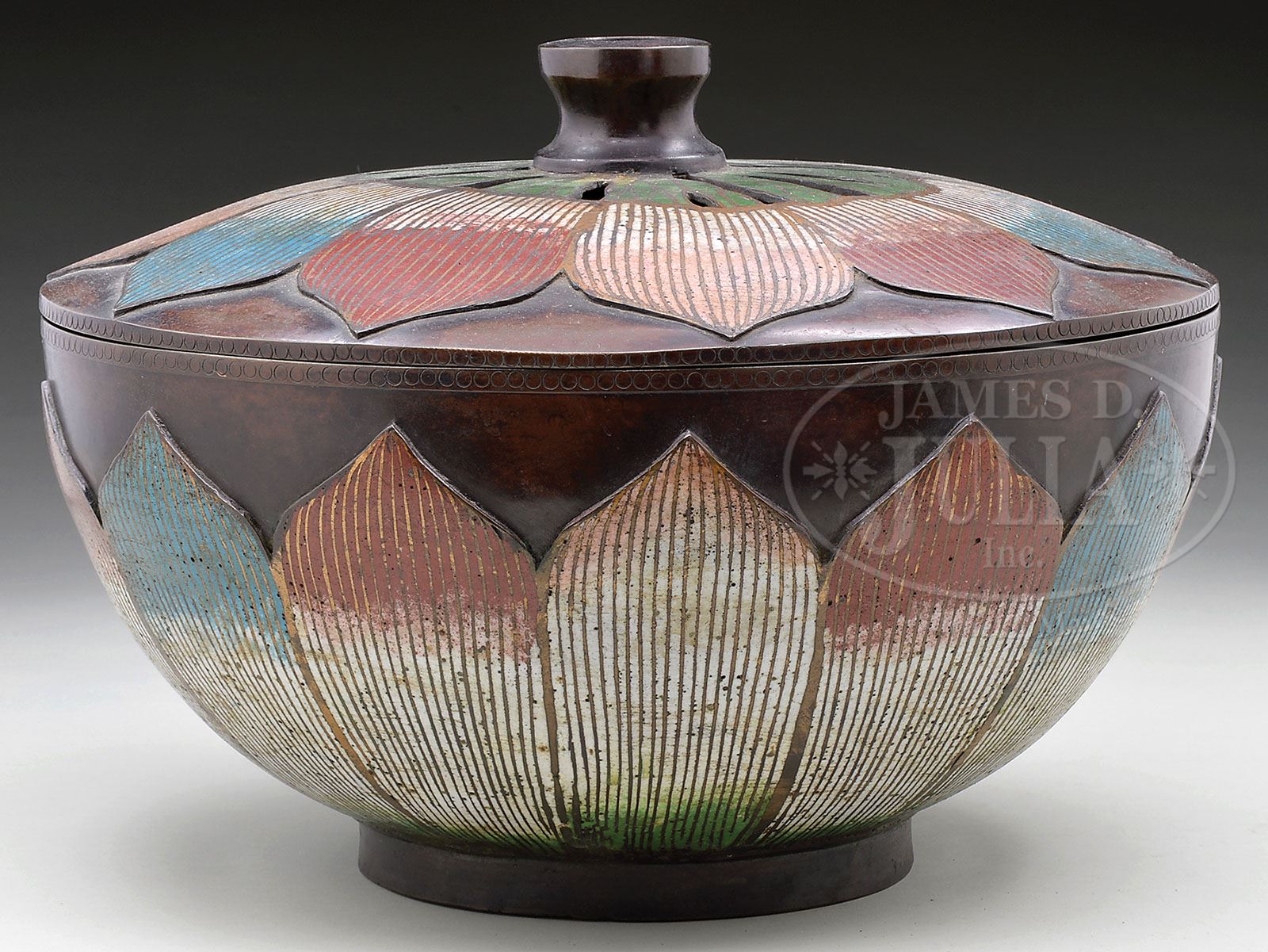 CHAMPLEVE CENSER. Early 20th century, Japan. Decoration of a lotus plant. Founder’s mark on the base. SIZE: 14″ dia. CONDITION: Very good. 9-29267 (1,500-2,500)