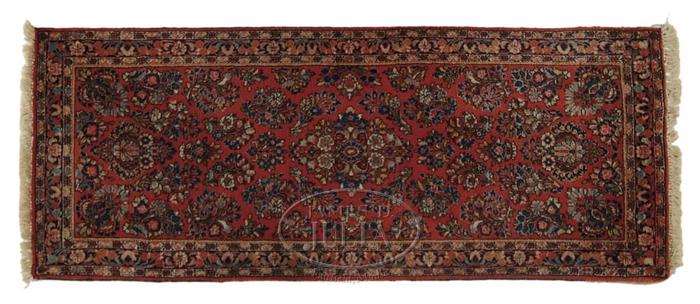 SAROUK SEMI-ANTIQUE RUNNER. Red field with all over flower design. PROVENANCE: The J. Hollis Wyman Estate, Milbridge, Maine (State Senator and Wild Blueberry King). SIZE: 6’5” x 2’6”. CONDITION: Very good. 9-29347 (300-500)
