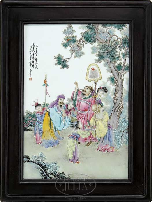 FAMILLE ROSE PLAQUE. Republican Period, China. Scene of the Immortals with attendants in treed landscape. Within a rosewood frame. SIZE: Sight: 21-1/4″ x 14-1/4″. CONDITION: Very good. 7-72979 (500-700)