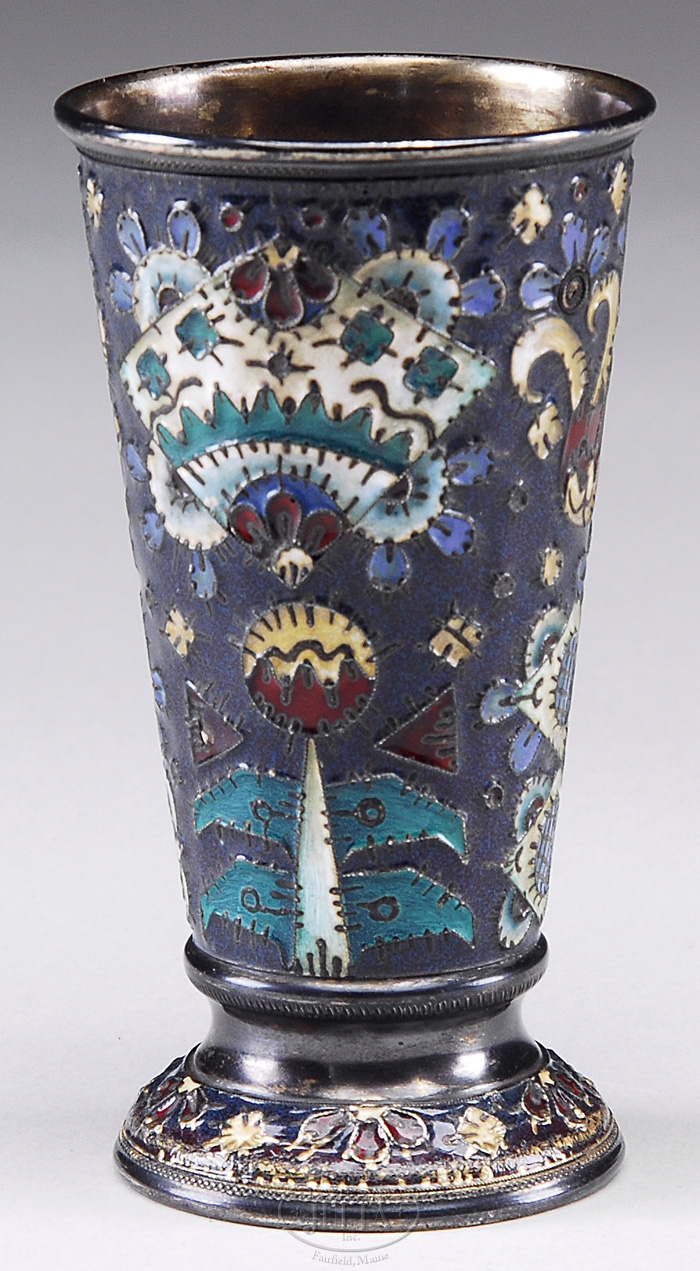 FEODOR RUCKERT ENAMELED DRINKING CUP. Circa 1884. This fine marked example executed by the silversmith Feodor Ruckert (1840-1917) active with Faberge from 1887. The cup with everted rim continuing to a tapering cylindrical body on a flaring circular footed base. The silver vessel decorated overall on the exterior with polychrome enamels in the champleve manner. The marks of the silversmith are in the center of base (see photo). Feodor Ruckert was one of Faberge’s workmasters and he was the only one who had also his own studio,with a permission from Faberge to work independently. His initials F.R (in Russian) can be seen on cloisonne enameled objects, near the mark of Faberge, made in the Moscow studio, sold by Faberge. SIZE: Ht 4 1/2″ Diameter 2 1/2″ CONDITION: Very good overall with minor and minimal roughness to enameled surfaces on base rim. No dents or repairs or other imperfections noted. 9-97093 (4,000-6,000)