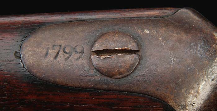 EXTREMELY RARE SPRINGFIELD MODEL 1795 FLINTLOCK MUSKET DATED 1799. Cal. 72. 44-3/4” rnd bbl. Walnut stock. Marked “SPRINGFIELD” in a downward arc vertically at rear of lockplate. A narrow winged eagle is over a script “US” in front of hammer. There is a very deep “00” condemnation mark at proofmarks at rear of bbl. Hammer is broken at front re-enforce but remains of a forging spur have not been removed. Top jaw and screw are reproductions. Faceted pan appears to be orig. Inside of lockplate is stamped “DW”. Bridle is broken but still functional. High dome lock screws are orig. Shortened ramrod is a replacement. CONDITION: Rust brown patina overall. Stock has been broken at wrist and repaired but not refinished. Mechanically good. 4-30275 FS8 (3,000-5,000)